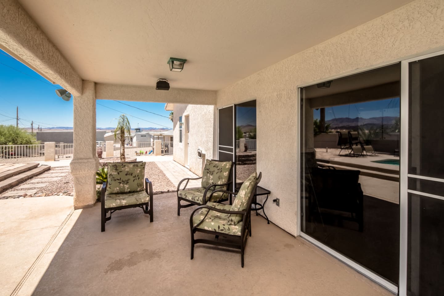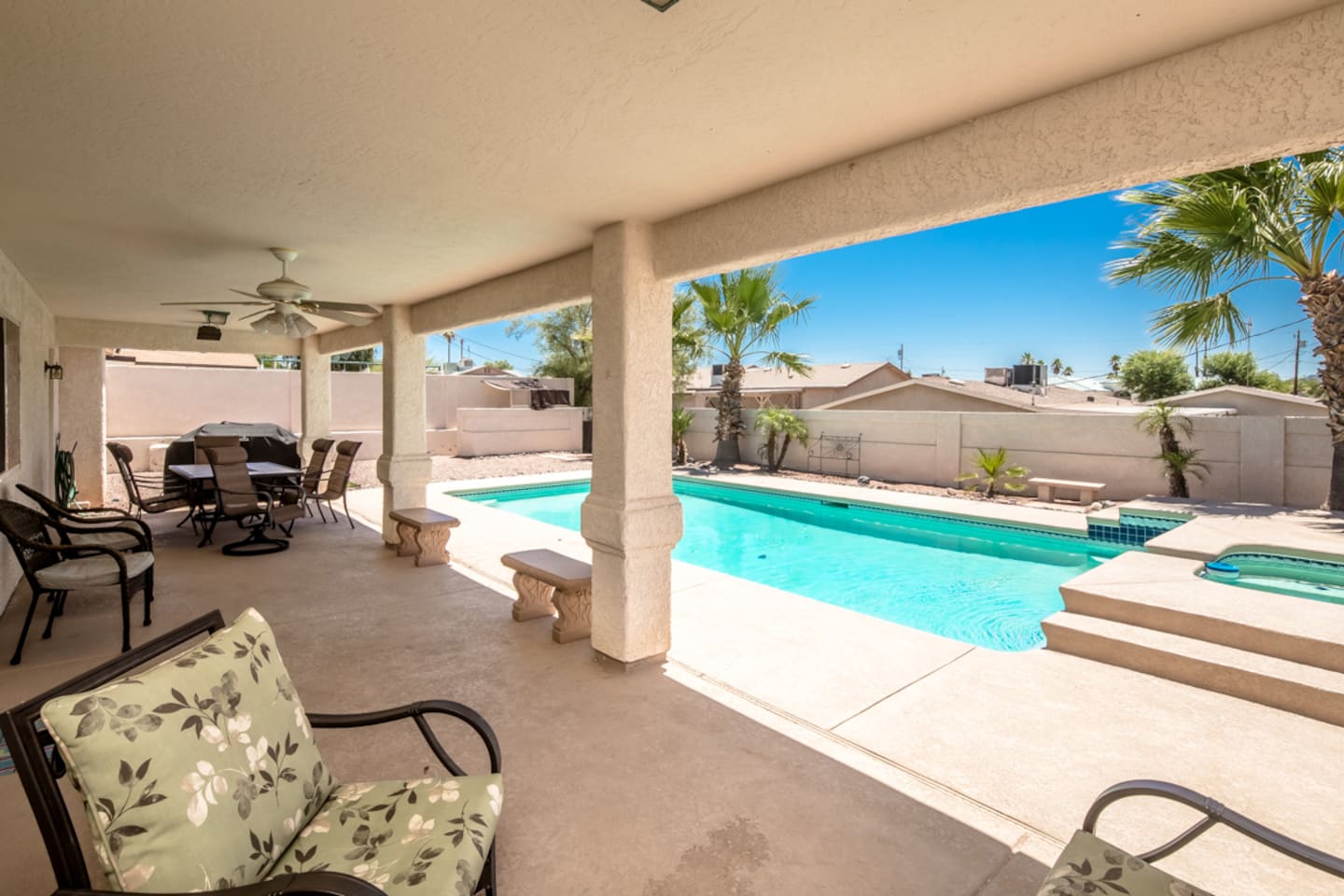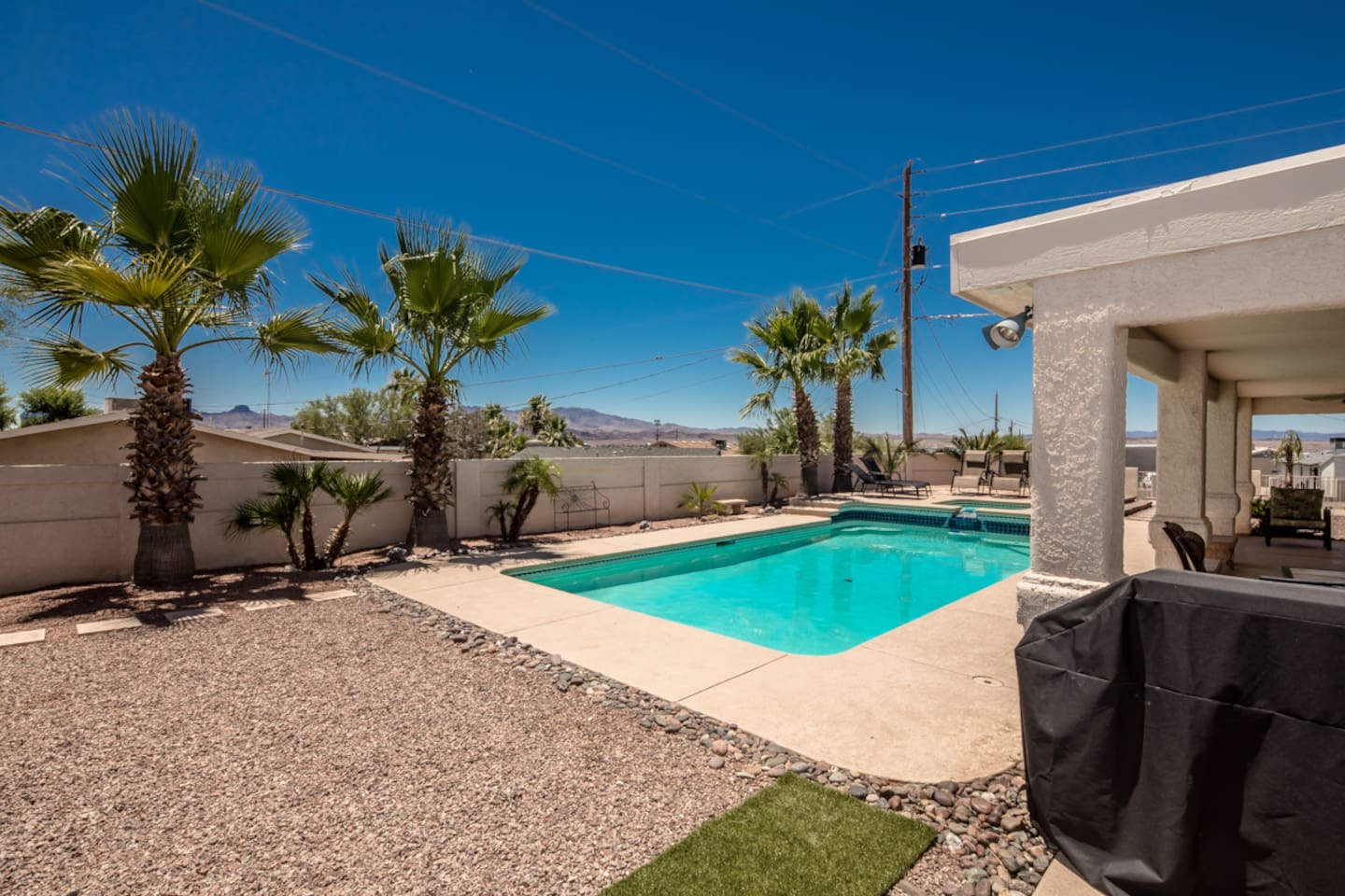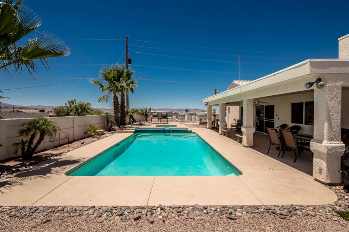 Step outside into your private backyard. The fully walled yard offers privacy and space to unwind, complete with a heated pool and spa, lounge chairs, and a shaded patio table—perfect for poolside drinks, outdoor dining, or soaking up the Arizona sunshine. Enjoy peaceful mornings and colorful sunsets with beautiful lake and mountain views as your backdrop.